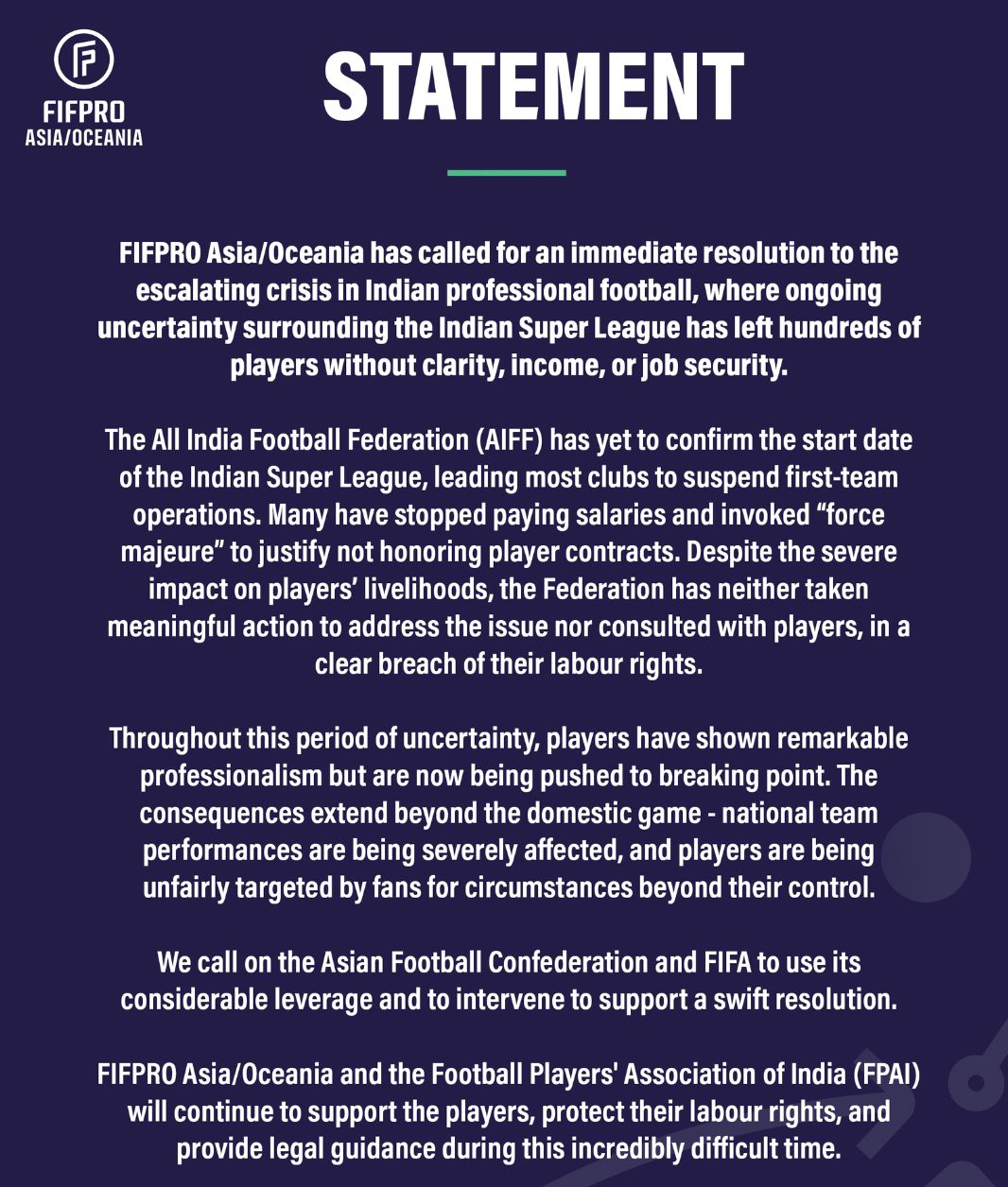 「FIFPRO亞洲、大洋洲分會呼籲,立即解決印度職業足球日益嚴重的危機。印度超級聯賽事持續不斷地不確定性,導致數百名職業球員面臨前途未卜、收入銳減、生活保障欠缺的困境。印度足球聯合會(AIFF)至今尚未確定印度超級聯賽事的開賽日期,大多數俱樂部叫停權的球員並拒絕以支付球員運動。