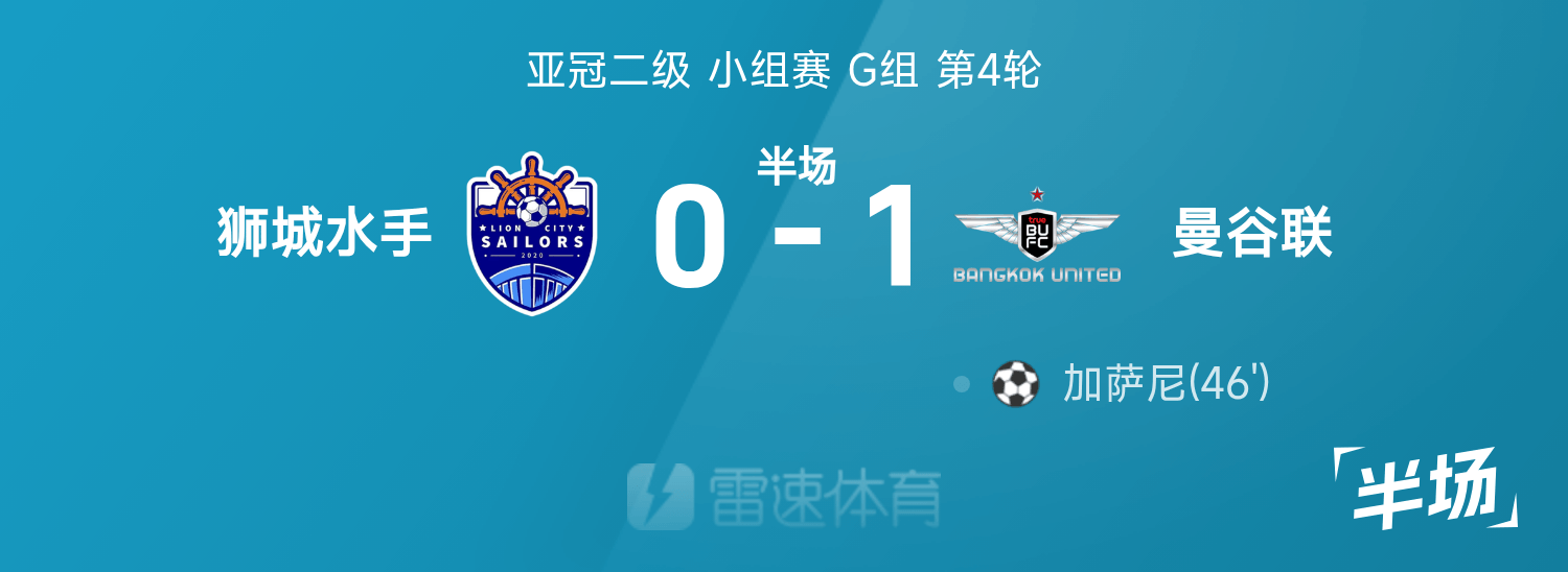 亞冠二級半場:加薩尼補時破門,獅城水手暫0-1曼谷聯