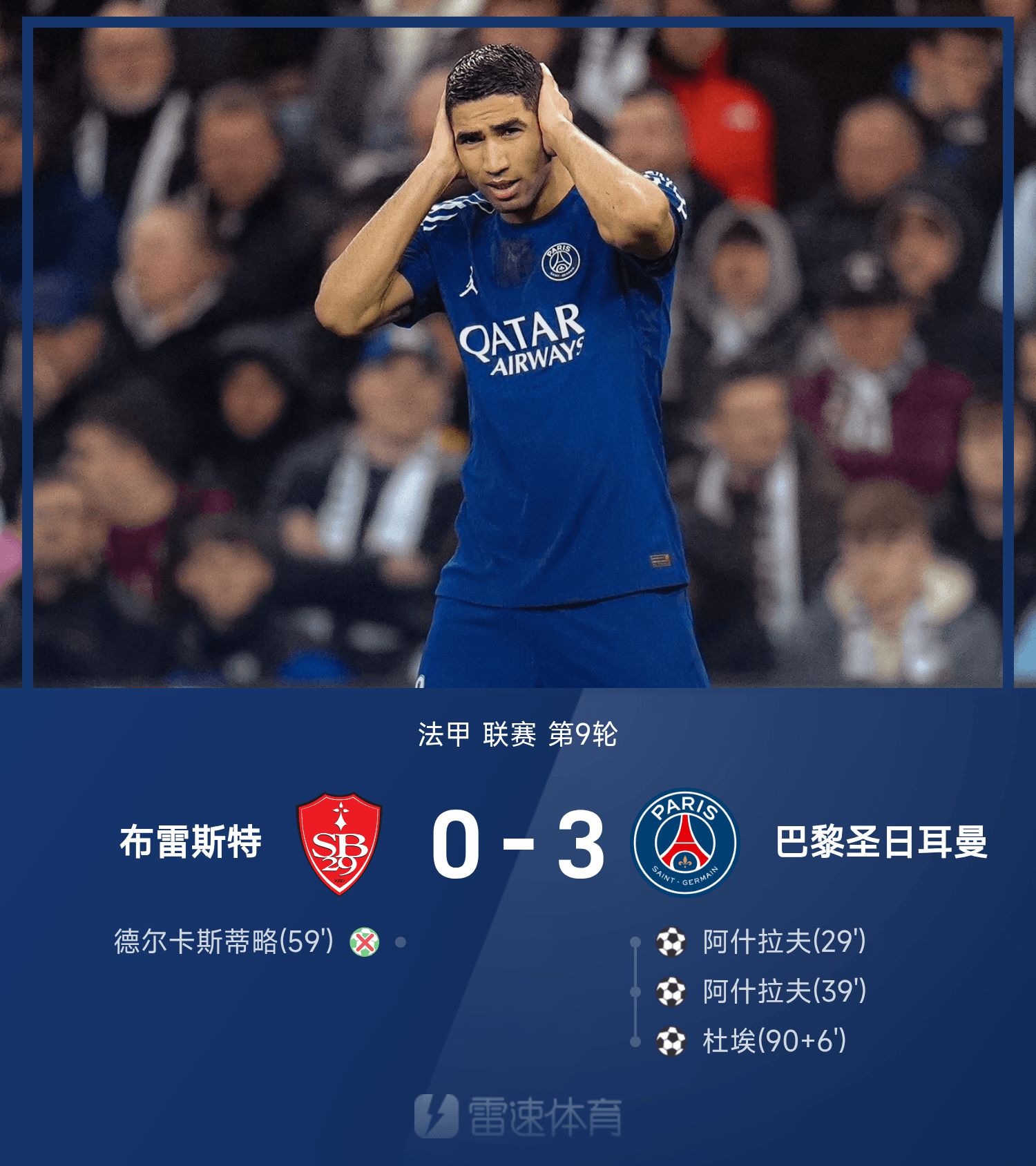 法甲戰報:阿什拉夫雙響,德爾卡斯蒂略失點,巴黎3-0布雷斯特