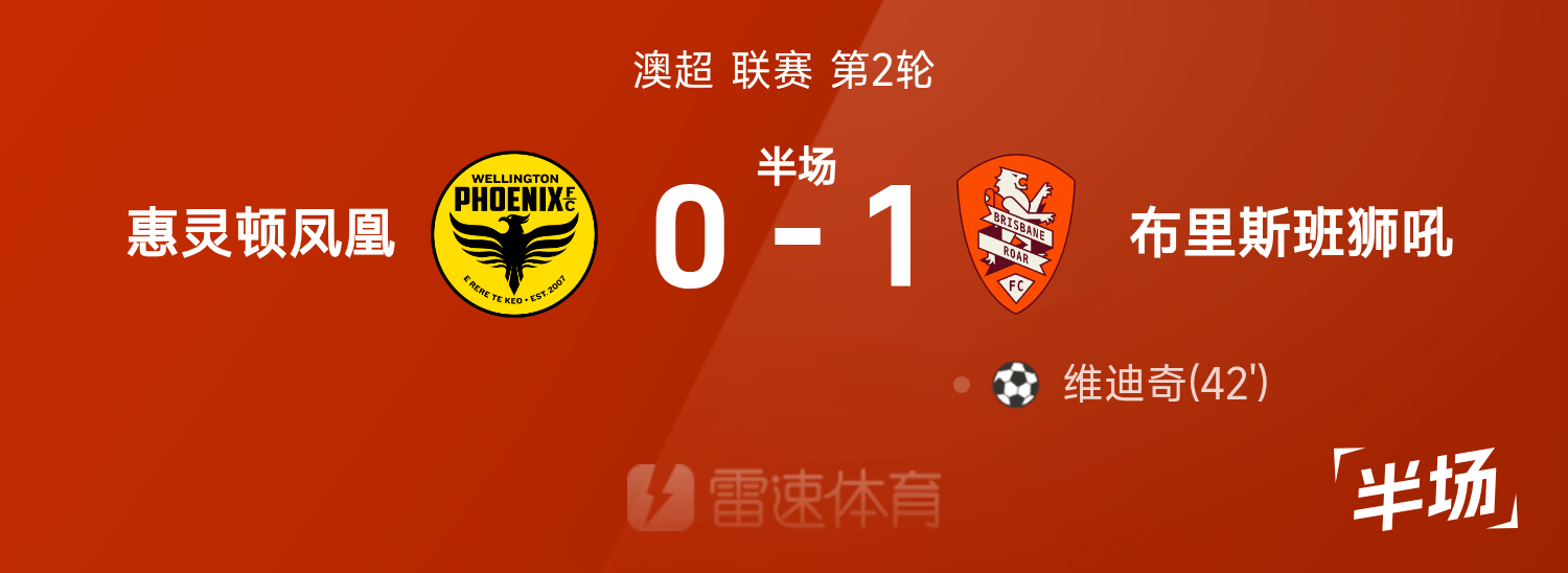 澳超半場:維迪奇反擊建功,威靈頓鳳凰暫0-1布里斯本獅吼