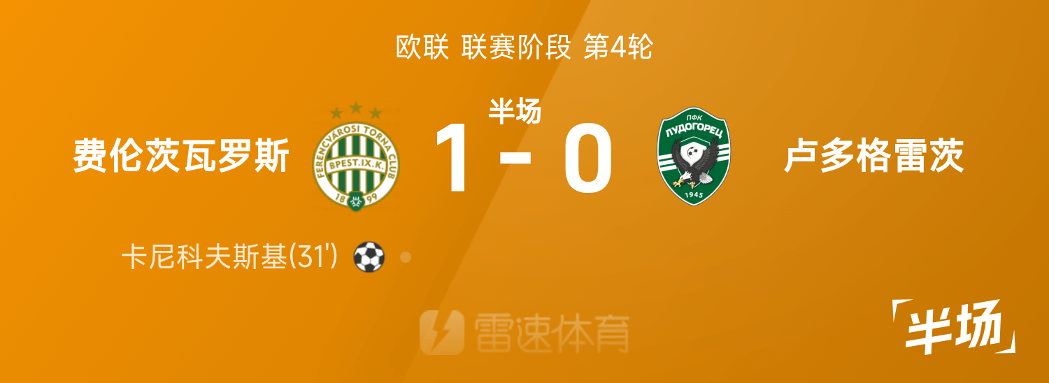 歐聯半場:卡尼科夫斯基破門,費倫茨瓦羅斯1-0盧多格雷茨